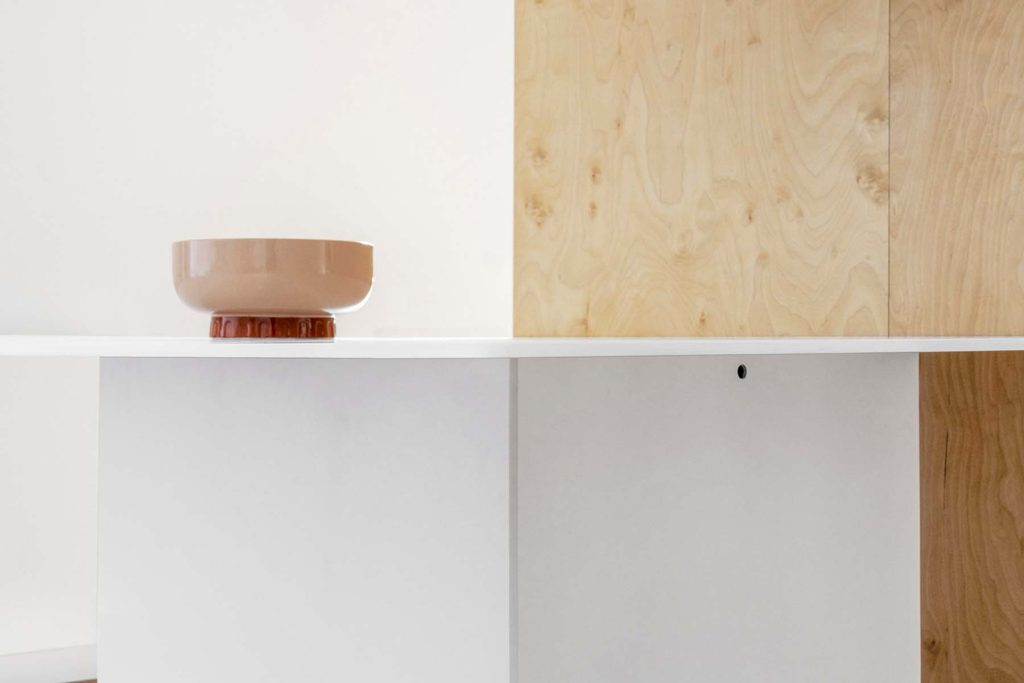 RAFA table Metallic dining table formed of a large solid cubic base in the centre and an ultrathin aluminium board, with wheels hidden inside the base to enable moving it from its usual location. The table is lacquered in texturised white and was originally designed as part of the furnishing project of an old and previously […]