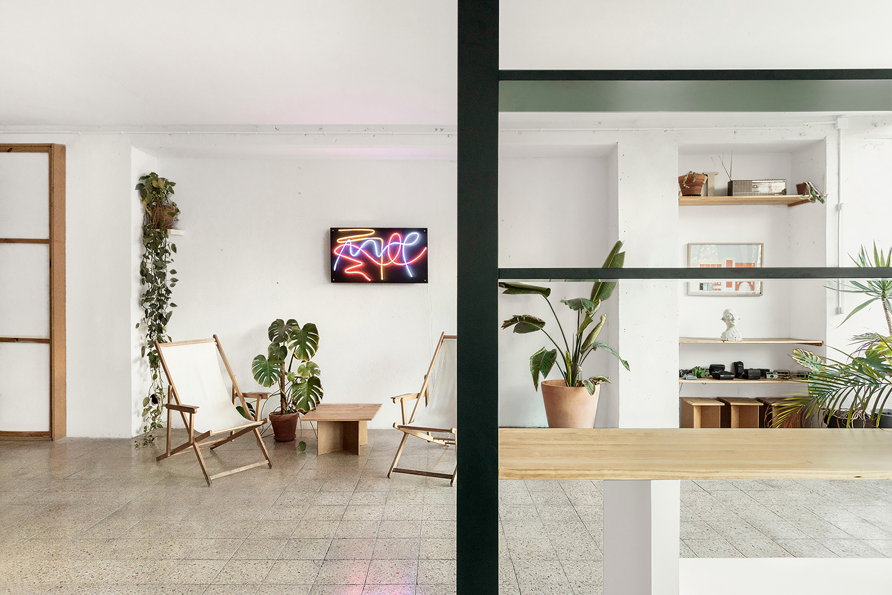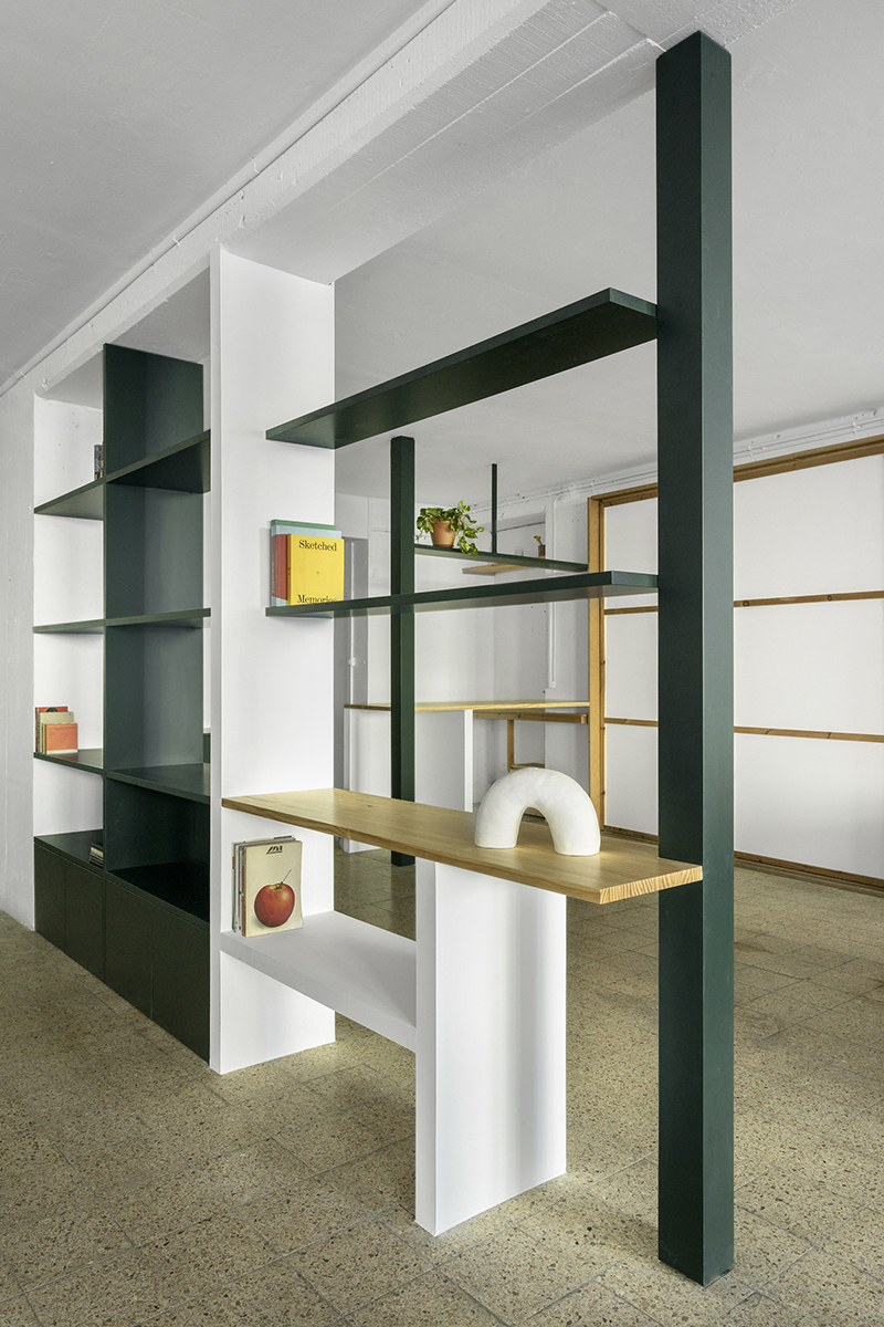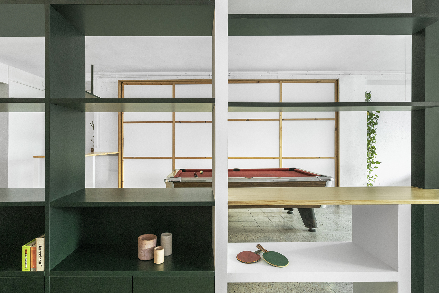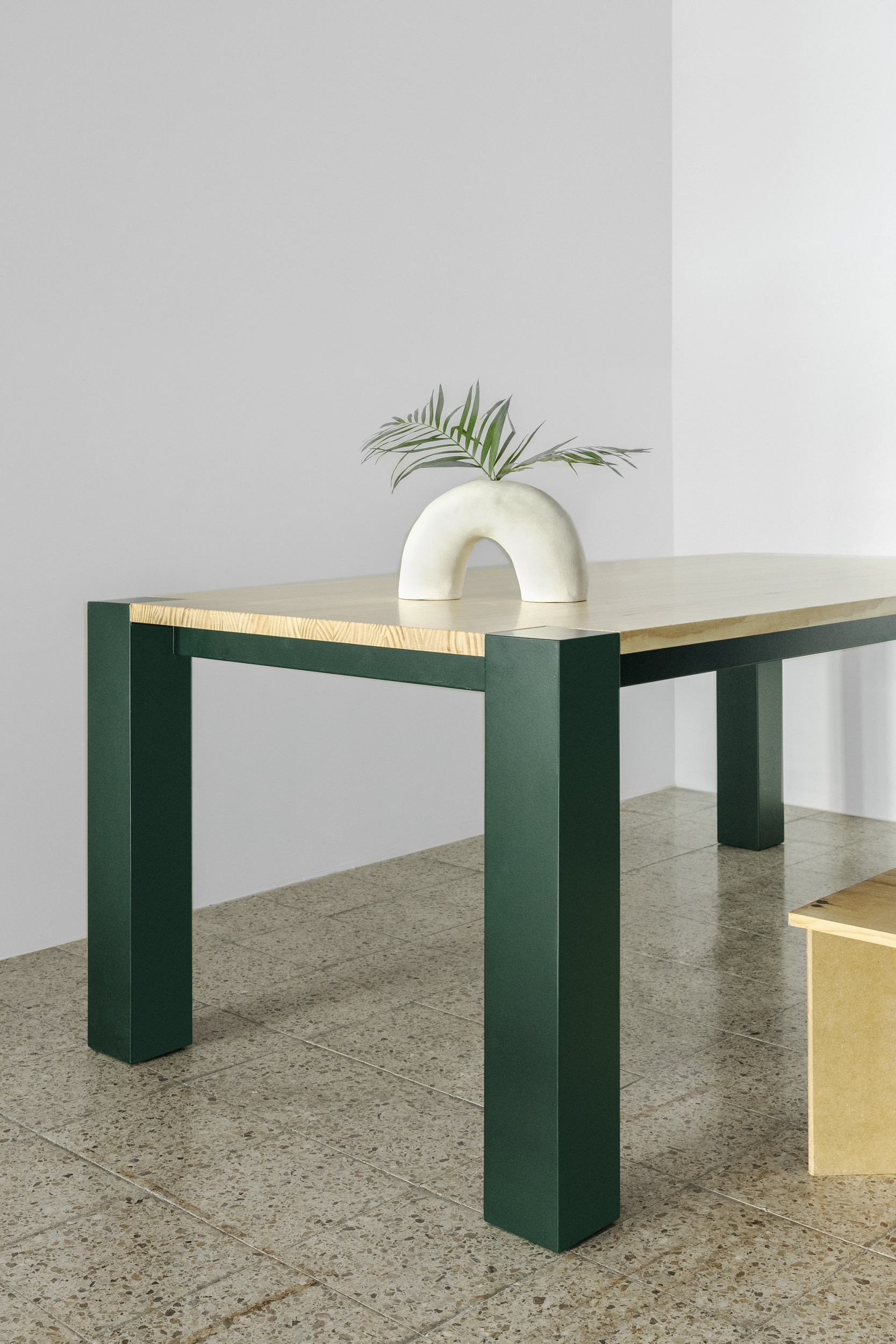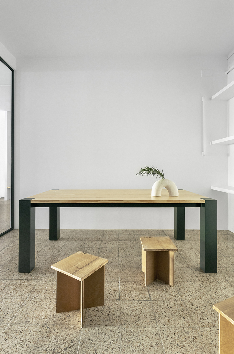 MARTE table Meeting room table designed for the workspace of Martes Studio. A fine pinewood board, supported by a metallic frame, contrasts with the sturdy legs that come through to the surface.