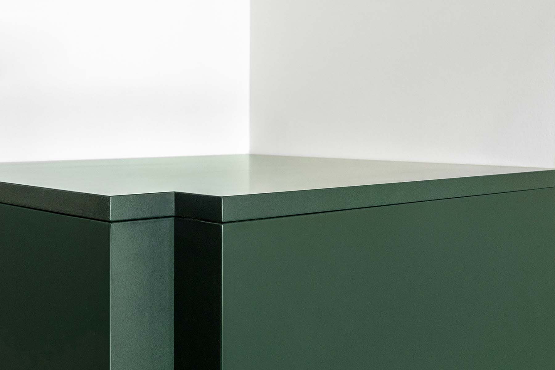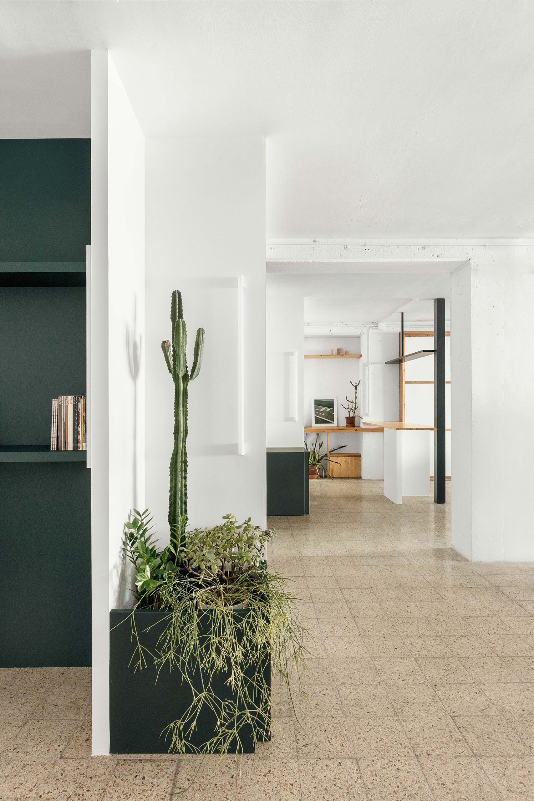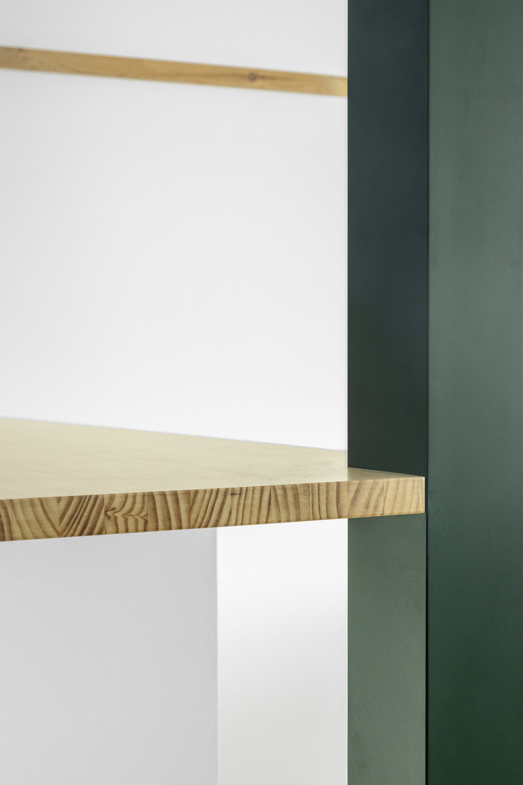 MARTES Office redistribution for the creative audiovisual company Martes Studio. This included the building of a new meeting room, together with an entrance hall and the design of different custom-made storage elements for the working space and some additional pieces for the break area. Solid elements in dark green, combined with pine wood boards, provide a distinct identity to the project.