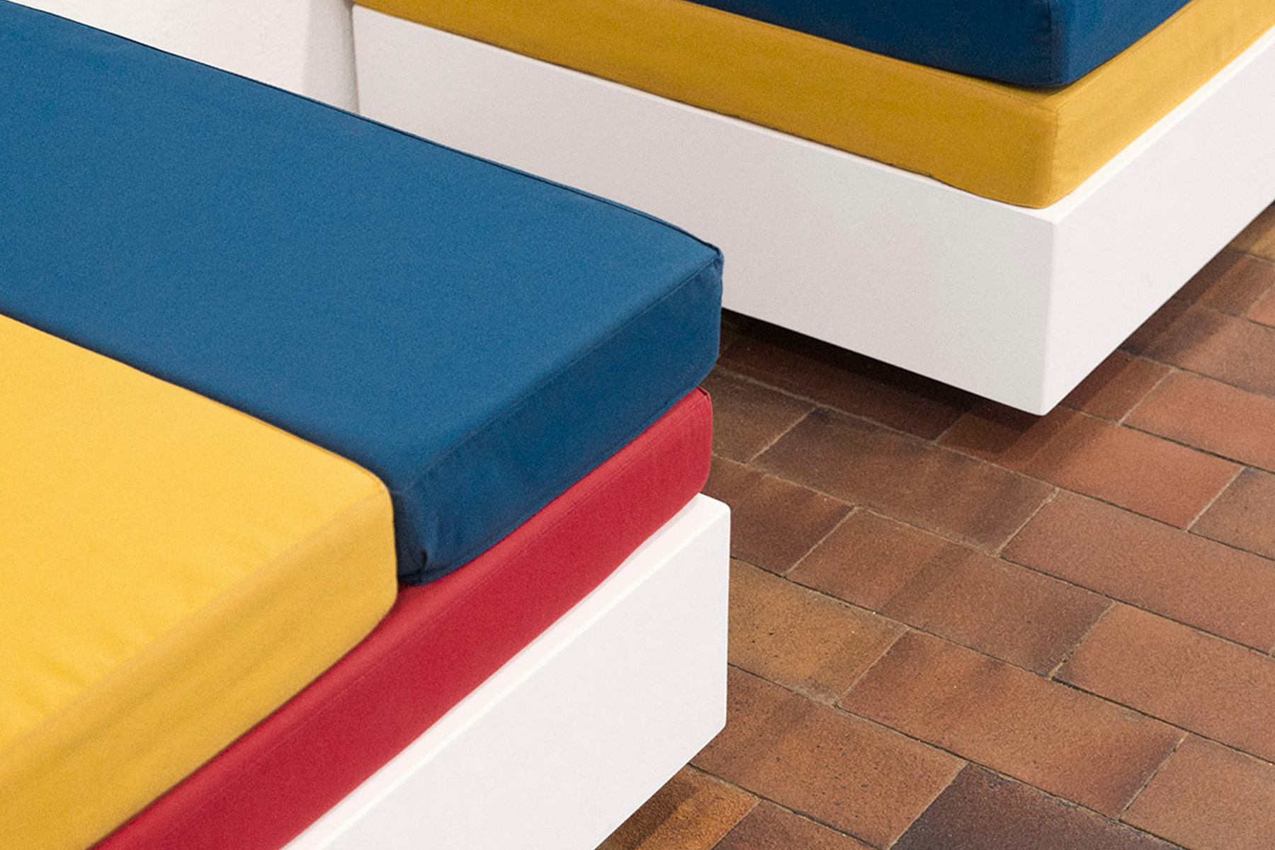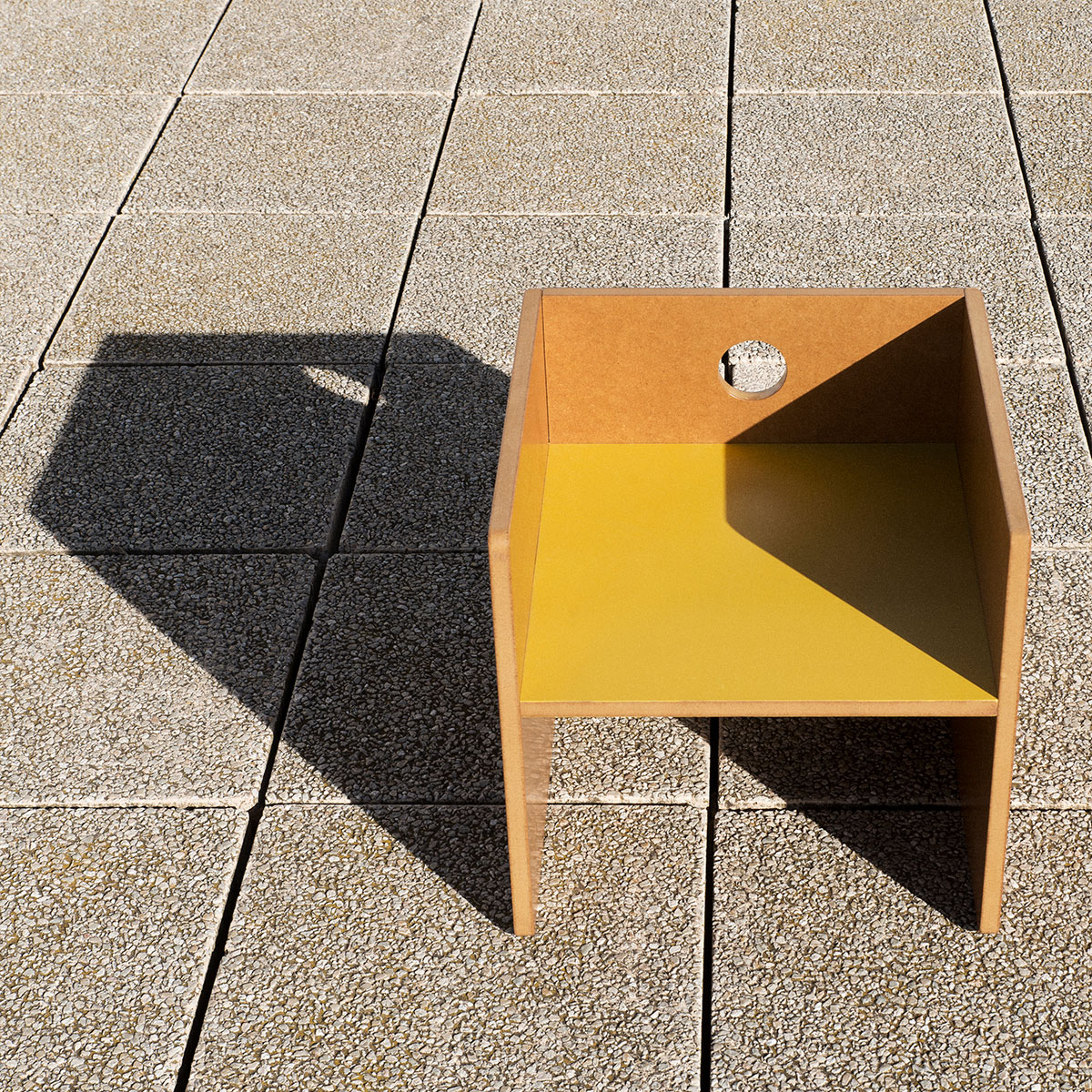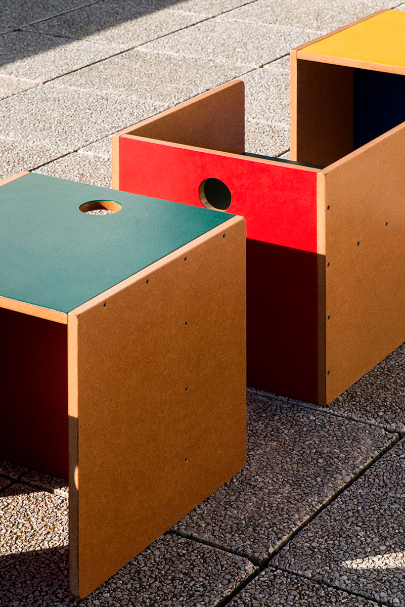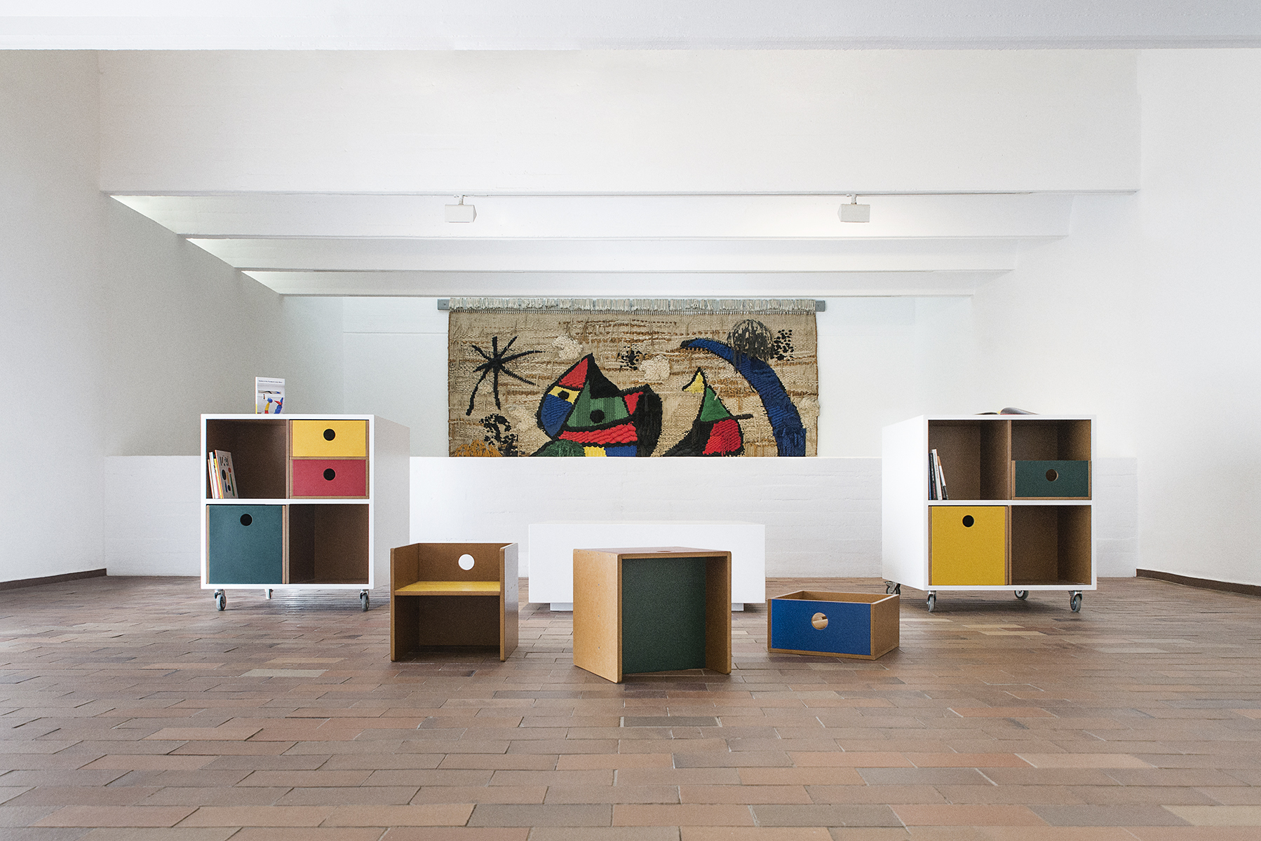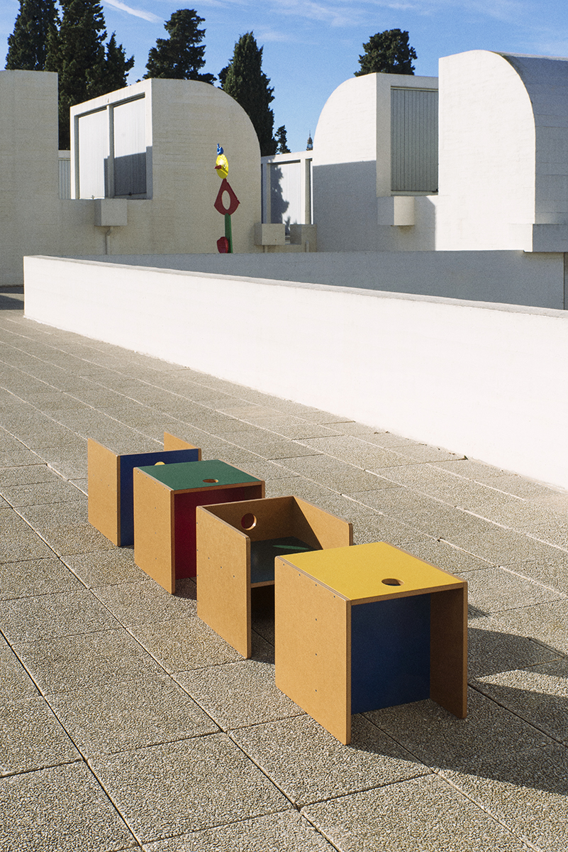 MIRÓ chair Multi-functional chair-table-stool for kids designed for the family space at the Fundació Joan Miró. It has different uses depending on its position. It is functionally based on Montessori philosophy and made with mdf boards combining primary colors.