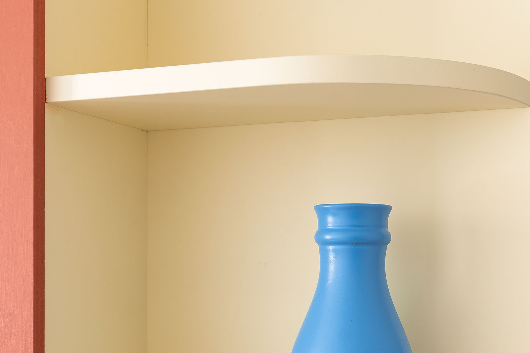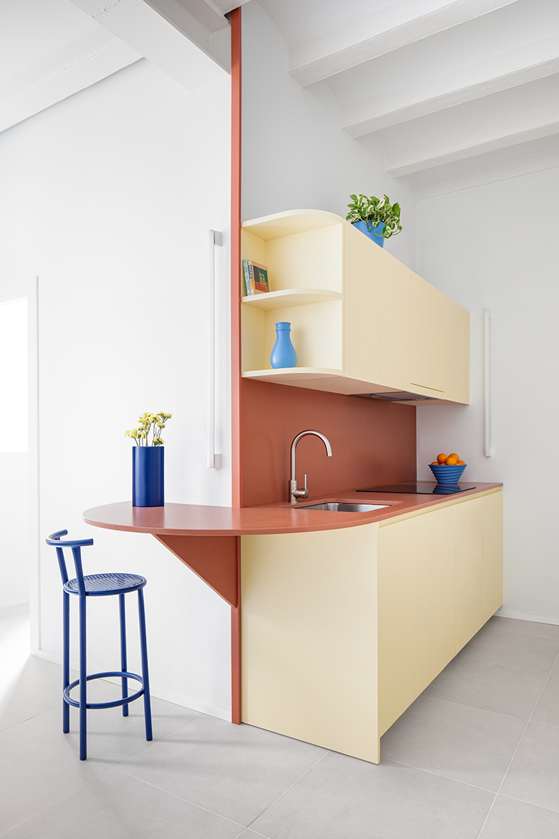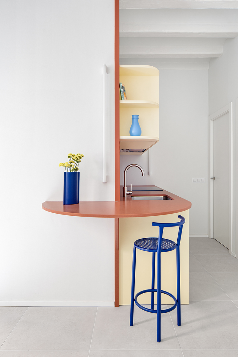 SANT ERASME Renovation of a small 38 m2 apartment in the historic centre of Barcelona. The kitchen becomes the central element of the project, extending to the living room through a semicircular countertop that works as a dining table. The terracotta countertop, in contrast to the soft yellow cabinets, gives singularity to this small but functional kitchen.