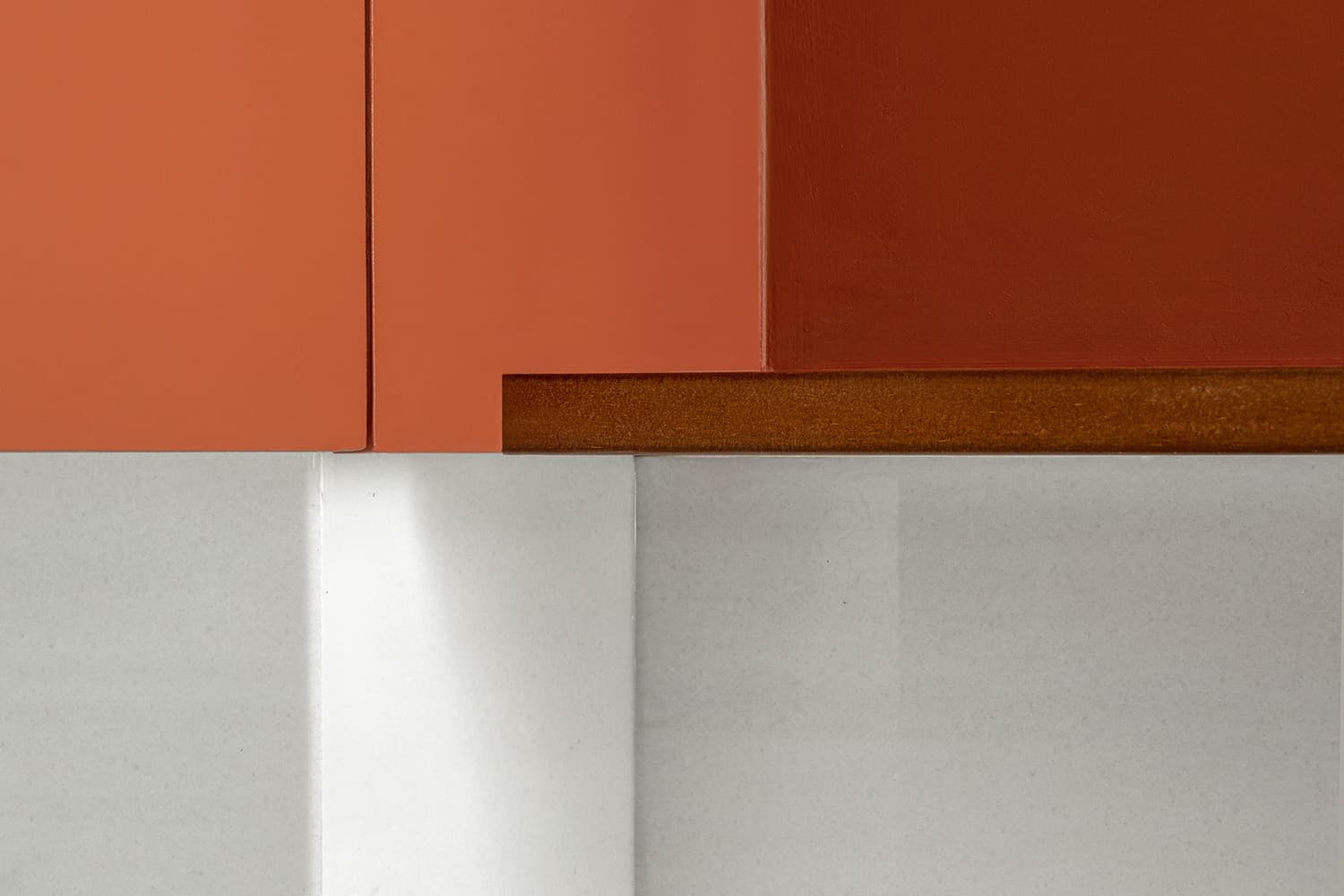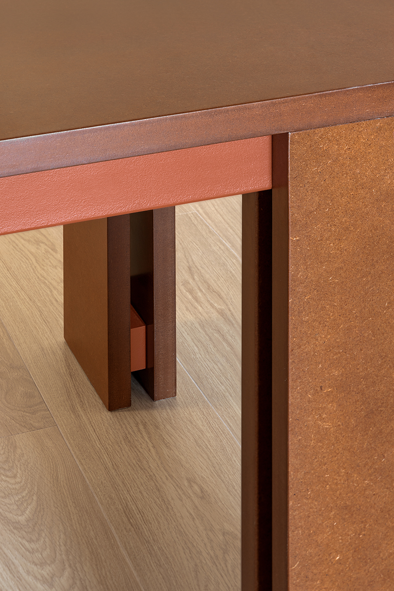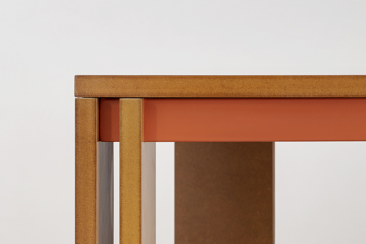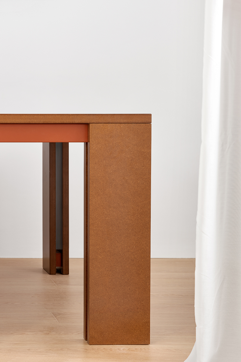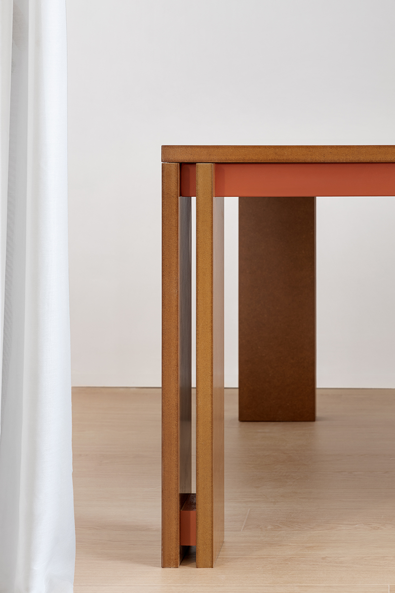 TEBU table Design of a dining table inspired by traditional Japanese interiors, aiming for a balanced mixture between a solid and delicate appearance, with mdf boards and a metallic perimeter structure.